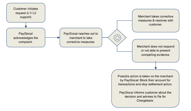 If the customer has received a response back from the merchant and is not satisfied with their response, the customer can raise a chargeback with their issuing bank (for card payments). These chargebacks will be raised with PayGlocal by the customer's issuing bank and PayGlocal will provide support to resolve the issue as per the chargeback guidelines.